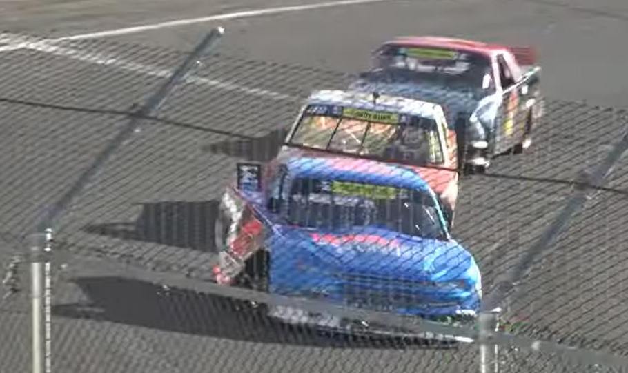 packed with competitors and fans. Noticeably absent in the pit area was the 15 of points leader Gerard Giordano Jr. Devin Deshaies put everyone on notice early that his Silverado had plenty of speed by leading both practices. Qualifying was soon to follow. Deshaies set fast time with a blistering fast time of 14.213. Time trials set the field from 7th back. The top 6 redraw for final starting position. Randy Burr drew the pole position. Devin would have to start 4th. ![]() Early season races often end up with early cautions. Immediately the yellow was out as #6 Andy Pellegrini got into turn one a bit too hard and ran in to the back of Charett's #1. Pellegrini spun. The 02 of Josh Stringer, and the 87 of Jim Thompson were also involved. ![]()