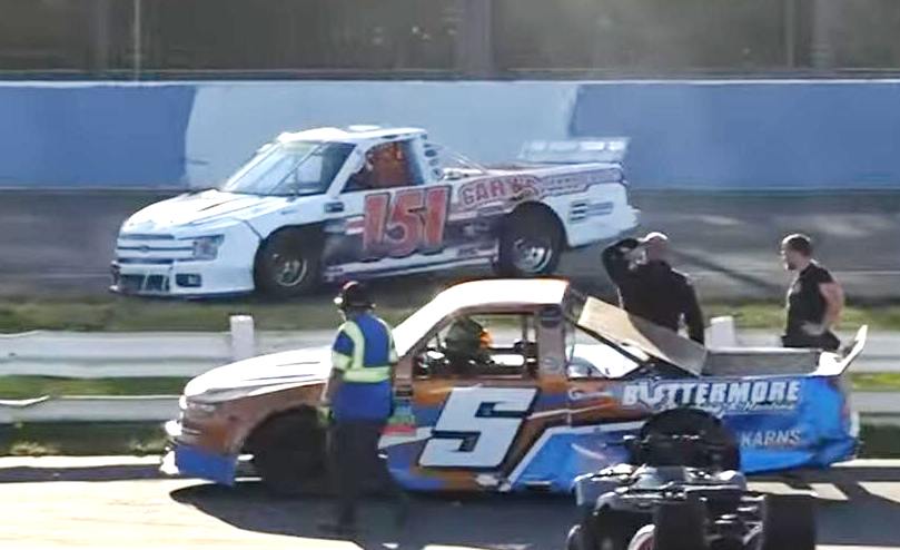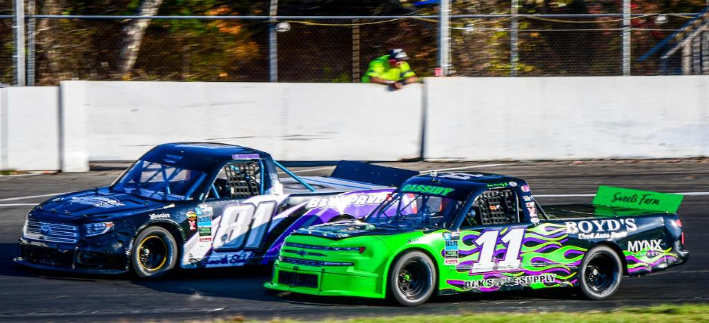 ProTruck drivers in 2023 were on hand to battle. Noticeably absent was the Monahan Family, Shawn, Diego, Emma, and Brody. Brody's record breaking success in the trucks in 2023 is well noted. The family was in North Carolina racing. The entire truck community is proud of Brody's accomplishments and is proud to have him representing New England in his racing ventures. Plenty of stars were left at home for the best show of the year. Ken Cassidy Jr. was on hand. His number 11 Boyd's Used Auto Parts Silverado with it's Lime Green Flame job was not only eye catching but fast. Former Champion Allen Coates made a rare 2023 appearance. Tyler Chapman had the 81 locked and loaded. Overdue for a trip to victory lane, Tyler has led every tour race he has been in the last two years. The Chase competitors had some serious business on hand. They were there to decide their share of the $10,000 dollars up for grabs. How they finish in this event determines how they end up in points. Nicholas Frechette, the regular season points champion, was unable to race after losing an engine at Thompson. It was a spectacular year for the Rookie driver. Unfortunately luck has regulated him to eight in this year's playoff. All eyes were on practice. Ken Cassidy took only 6 laps to show everyone he was fast as he set a lap of 16.317 , 82.7 mph. Chase Final Four Competitor Randy Burr tipped his hand that his truck had pace in the second practice with a lap of 16.226, 83.199 mph. When qualifying rolled around, Cassidy grabbed the pole over Burr by a mere 3 hundredths of a second. The top 6, redraw for starting position. Crowd favorite Todd Taylor, in his Buttermore Plumbing 47 had luck on his side. After all other 5 competitors drew, he was left with the top starting spot . ![]()